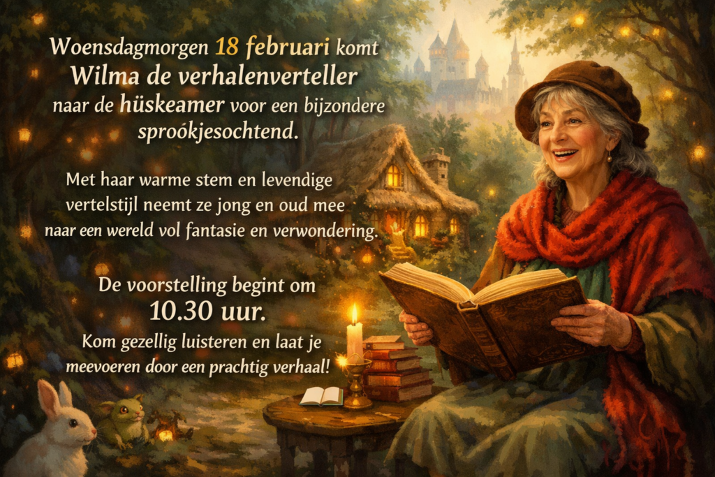 Woensdagmorgen 18 februari komt Wilma de verhalenverteller naar de hûskeamer voor een bijzondere sprookjesochtend. Met haar warme stem en levendige vertelstijl neemt ze jong en oud mee naar een wereld vol fantasie en verwondering.